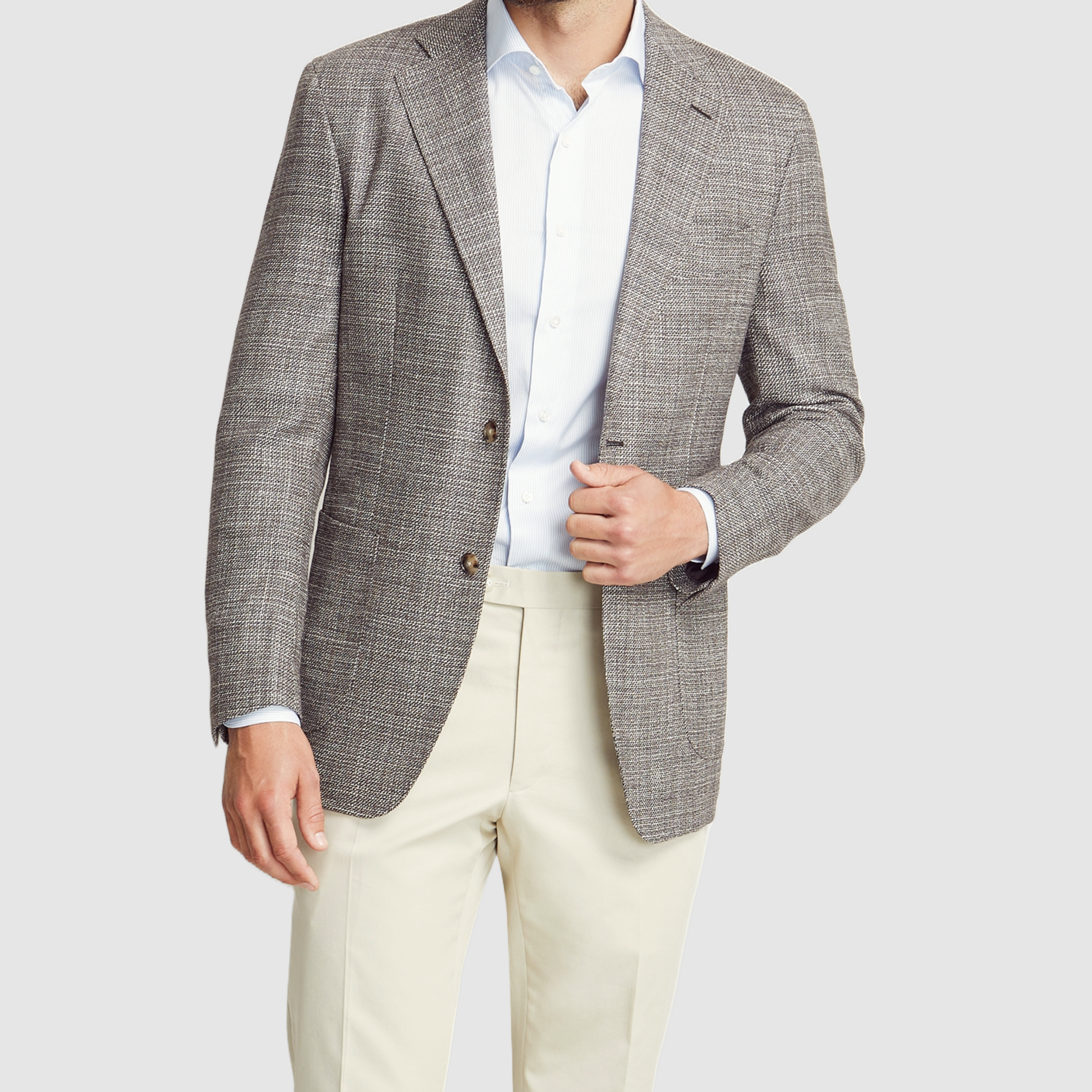 Pair with: White or light coloured shirt, cotton dress trousers, brown loafers, open collar